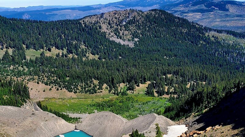 The more direct route back to the trail is following the path down the creek to Golden Lake and from there, rejoining the Green Lakes Trail. Hikers can either return to Green Lakes over the pass or travel northeast to Park Meadow and from there to the Park Meadow trail head near Three Creeks. This second option will involve hiking through over 4.5 miles of burned forest, however. Both methods can be done in a long day, those coming from Green Lakes hiking over 18 miles and those coming from Park Meadow close to 17 miles. Others could pack in camping supplies and better explore and enjoy the day in the area.
